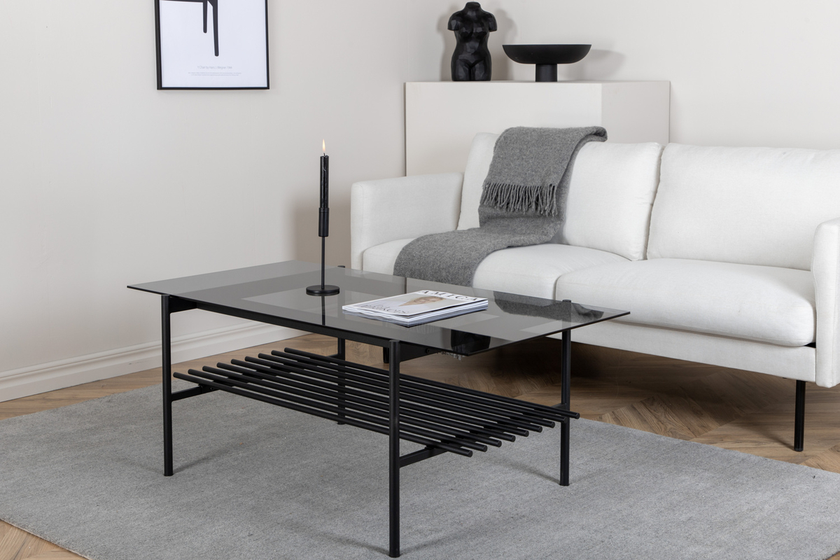 Decorează-ți casa într-un mod elegant și modern cu o masă de designer în stil industrial! Masa pentru revistă Von Staf are un design dreptunghiular cu forme scandinave drepte și un design elegant de raft cu nervuri - elegant și practic pentru depozitare suplimentară. Blatul zvelt este din sticla neagra afumata, iar rama decorativa este din metal negru. Du designul interior la nivelul următor și creează o cameră de zi care va atrage atenția! Dimensiuni masa: 60x120x48 cm.