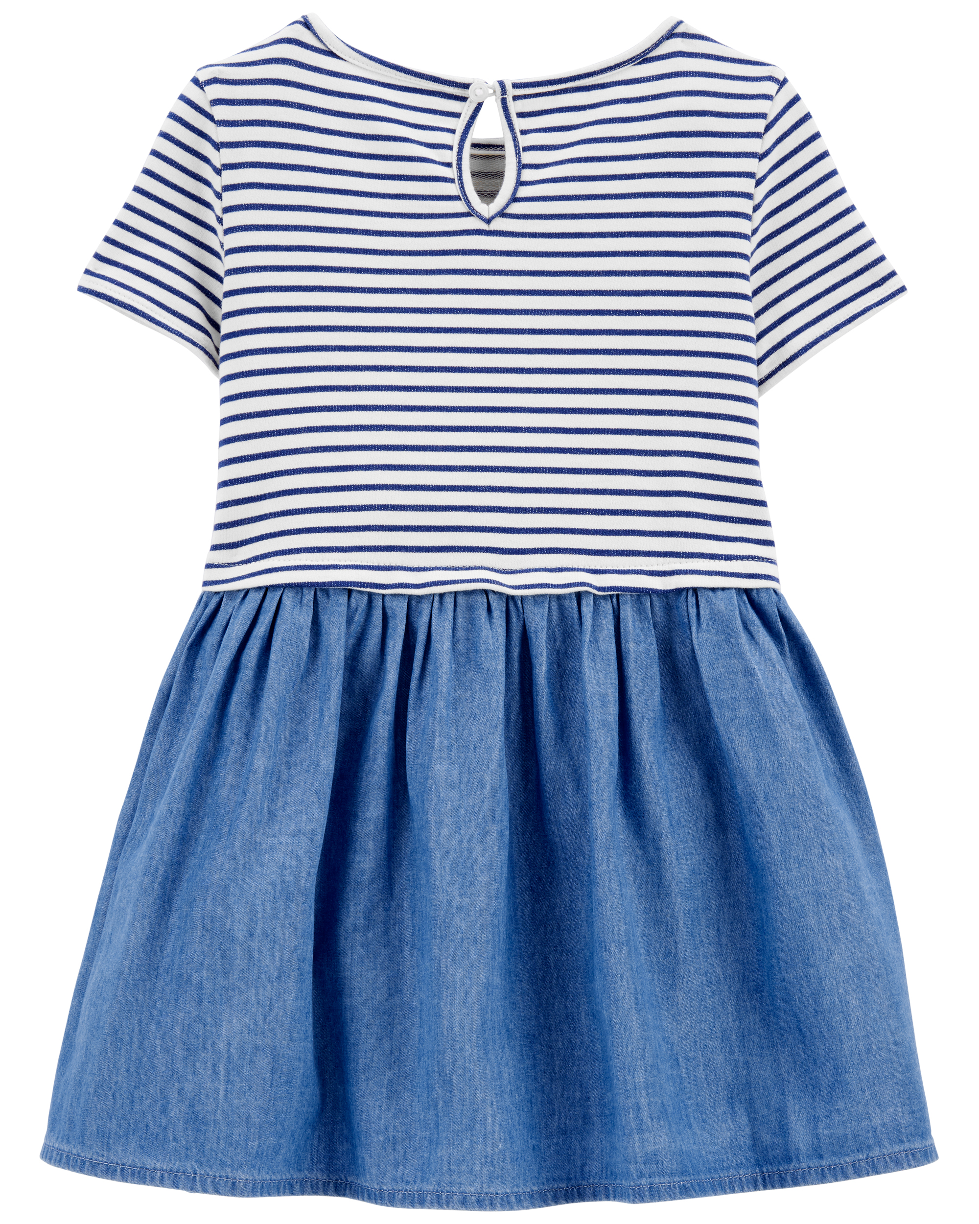 Мгновенное модное решение! Классические темно-синие полоски плюс юбка из легкой джинсы создают очаровательное сочетание в этом милом весеннем платье.