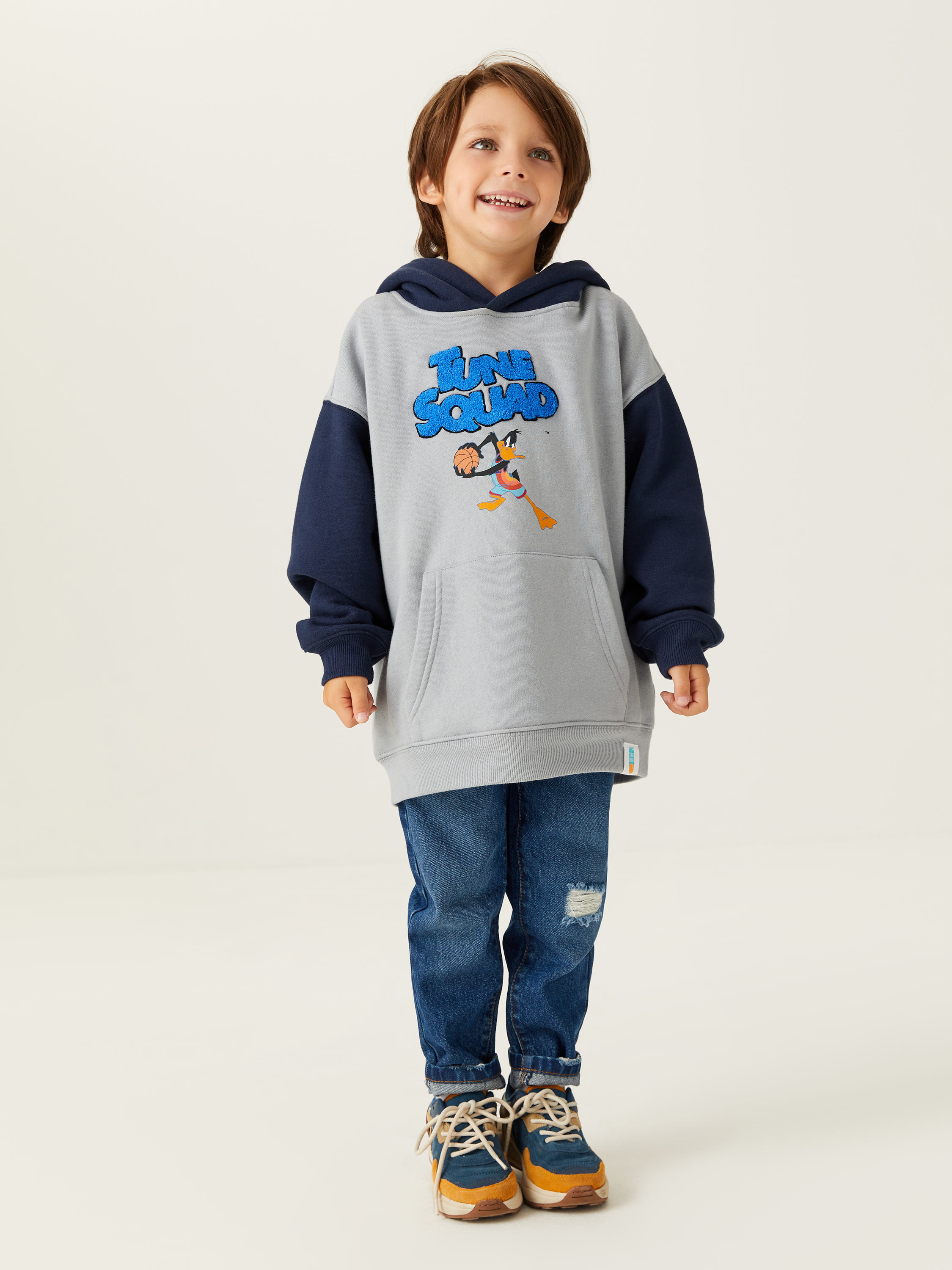 Худи с принтом Looney Tunes на груди и спинке - Свободный крой - Капюшон - Спущенное плечо - Длинный рукав - Накладной карман-кенгуру - Резинка на манжетах и снизу - Изнанка с начесом - Декоративный патч снизу - Коллаборация с Warner Bros. Возраст: 2-6 лет Сезон: ОСЕНЬ 2021 Состав: 60% хлопок, 40% полиэстер Артикул: 1808060461