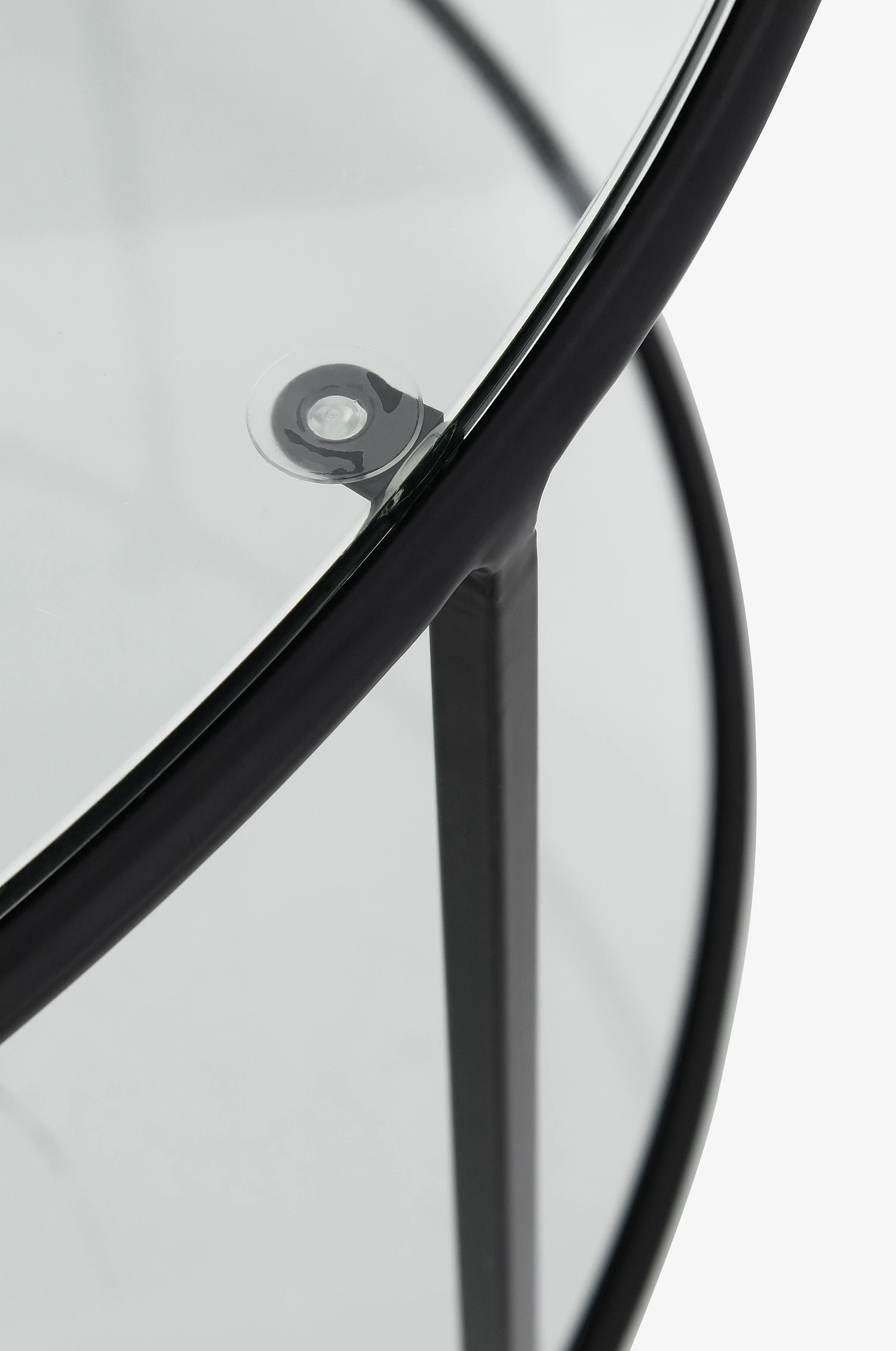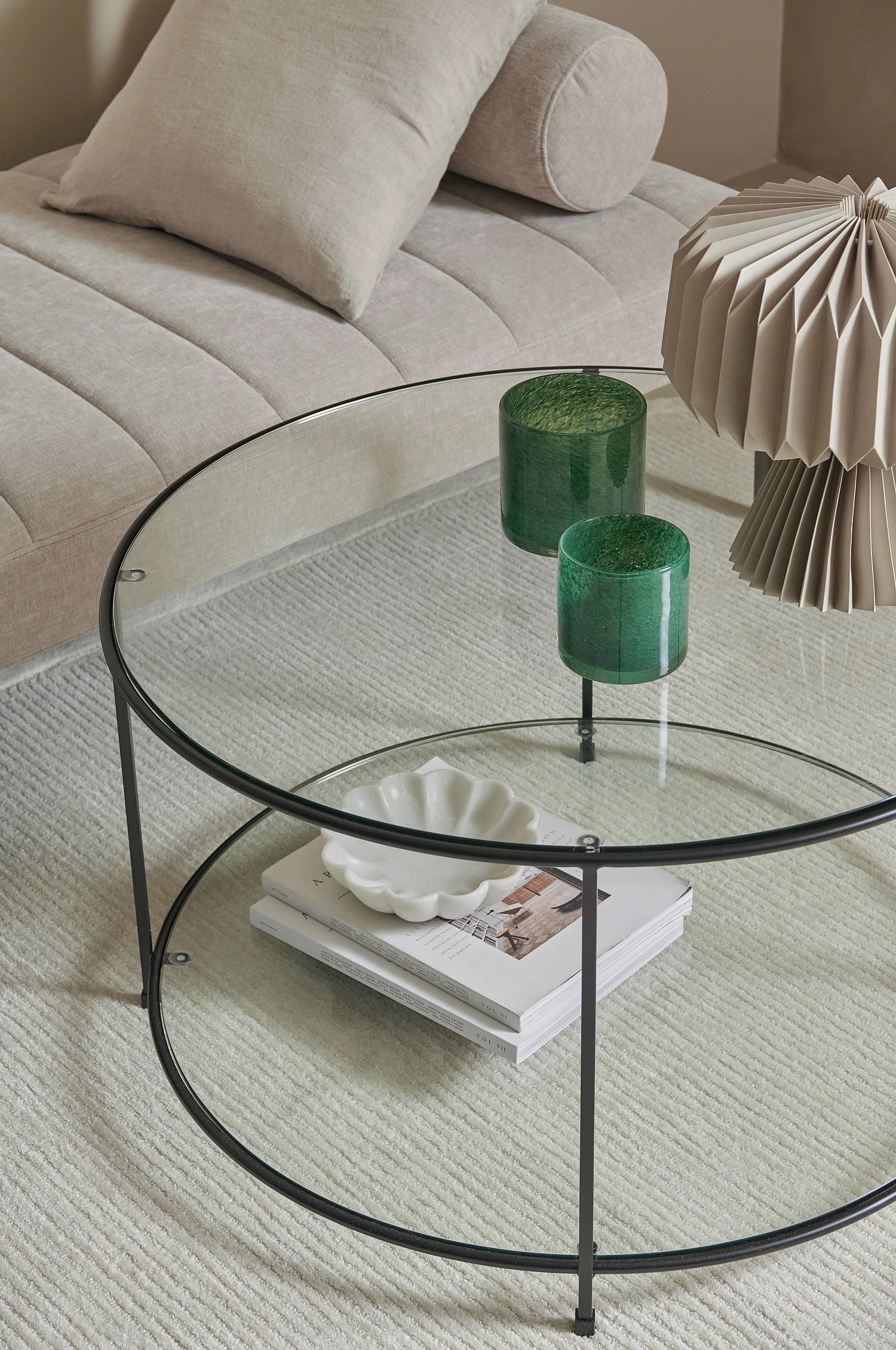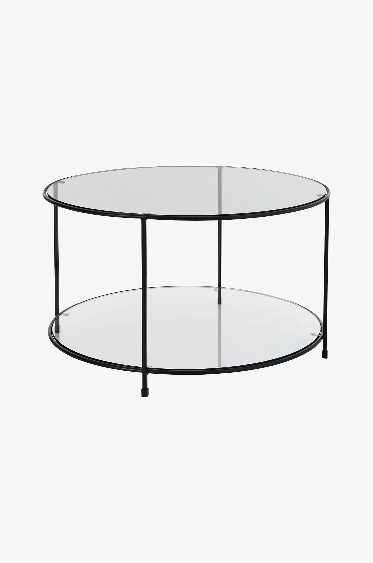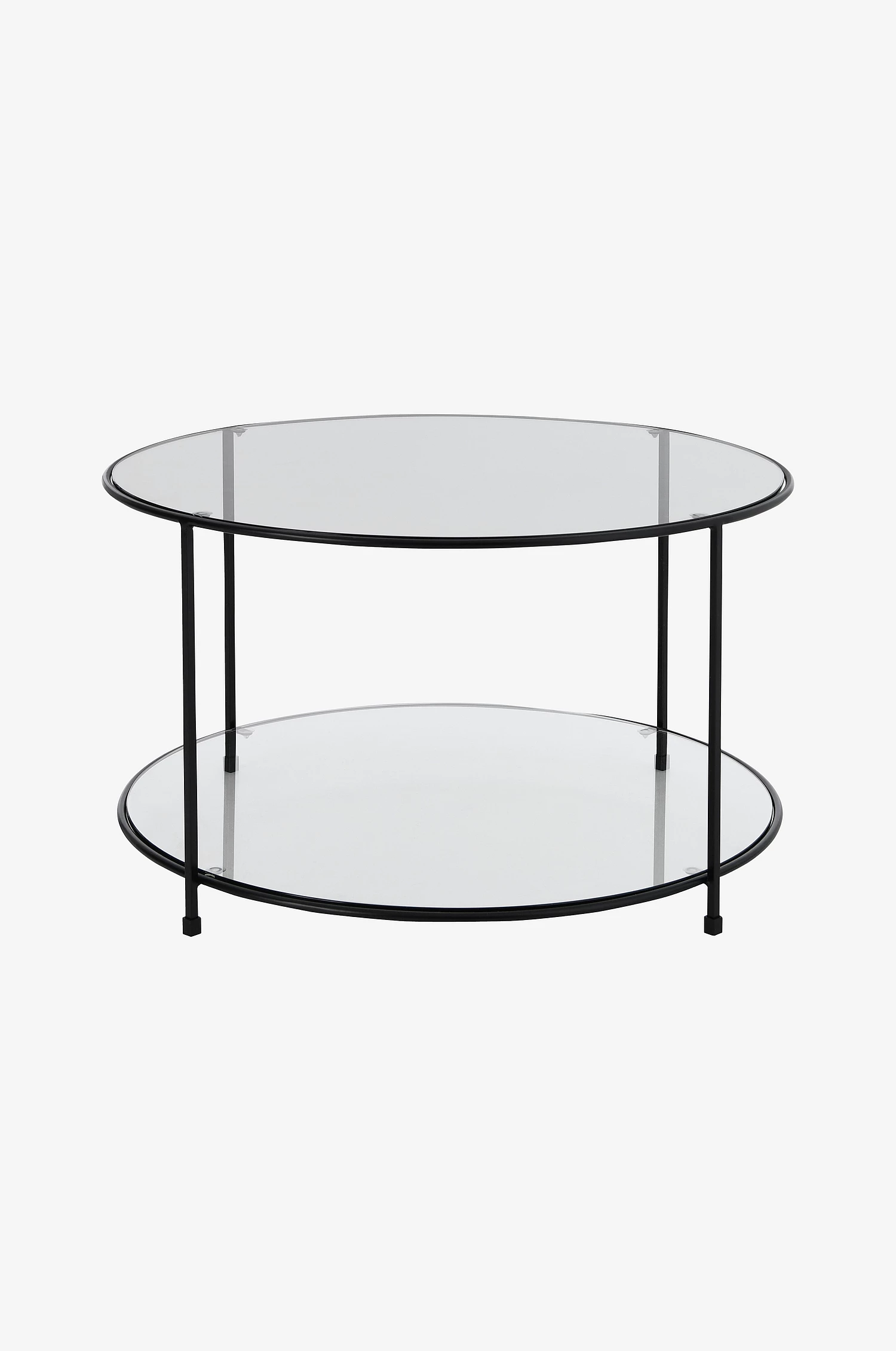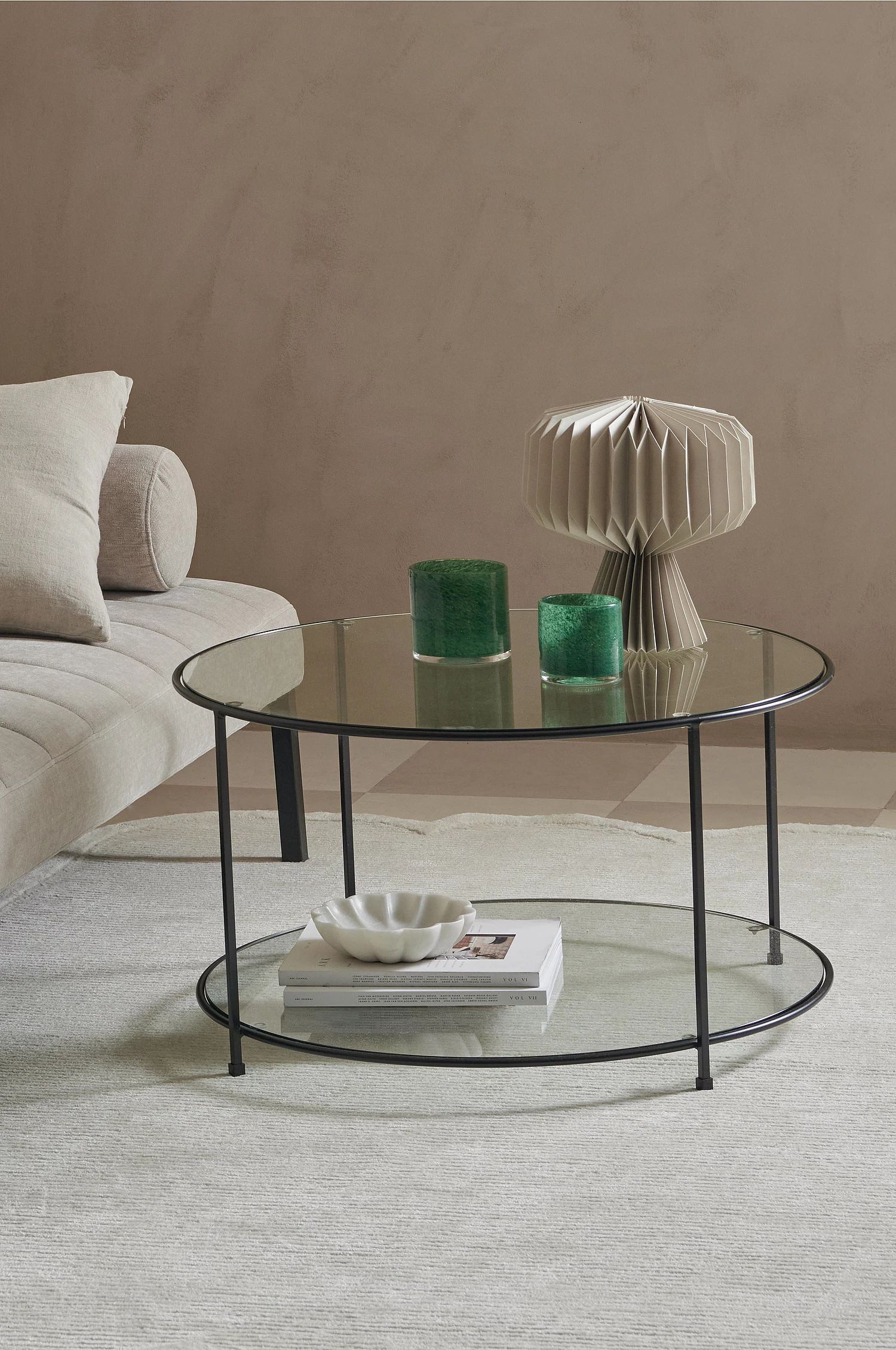 Устойчивый и удобный в установке круглый журнальный столик с каркасом из металлических трубок цвета латуни и двумя уровнями с панелями из закаленного стекла.