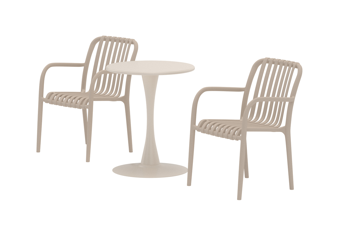 Комплект Limnos бежевого цвета — стильное и практичное решение для балкона, террасы или сада. Комплект состоит из двух удобных стульев и круглого стола, объединенных единым дизайном, создающим современный и гармоничный вид. Классический бежевый цвет позволяет Limnos легко вписаться в различные интерьеры, становясь уютным местом для кофе, завтрака или спокойного отдыха на солнце.